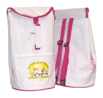 • Descrição: Mochila com alças para as costas, regulador, fechamento por cordão, bolso frontal, zíper e base circular