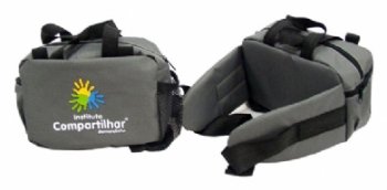- Descrição: Pochete com alça de mão e 2 bolsos com zíper, fechamento com engate plástico.