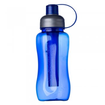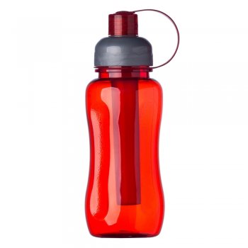 • Descrição: Squeeze plástico. Squeeze colorido acinturado com detalhe retangular texturizado nas laterais, possui tampa cinza com detalhe ondulado ao redor e tampa com alça para o bico. Parte interna possui uma barra congelante(desencaixe a barra da tampa), encha a barra e coloque no congelador/freezer para gelar e depois e só colocar novamente no squeeze.