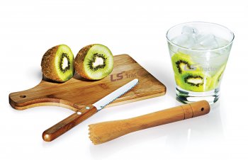 • Descrição: Kit para caipirinha. Conta com tábua e socador em bambu; copo de vidro 350ml; faca para frutas de 4” em aço inox.
