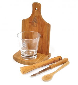 • Descrição: Kit composto por seis acessórios para caipirinha, sendo um copo em vidro de 350ml, um socador/pilão em Bambu, uma faca para frutas de 4” em aço Inox/Bambu, uma colher em Bambu de 18cm e uma tábua pequena em Bambu com cabo e orifício.