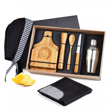 • Descrição: Kit caipirinha contendo tábua em Bambu, faca para frutas 4" em Inox/Bambu, pilão, colher de 18cm e base para a tábua em Bambu, coqueteleira de 350ml em Aço Inox, touca e avental com bolso em Brim preto. Acomodados em uma linda caixa para presente.