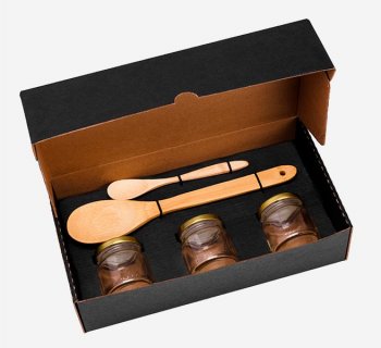 • Descrição: Conjunto para temperos, com 3 potes de vidro com tampa e 2 colheres, uma com 30cm e outra com 18cm, em Bambu.