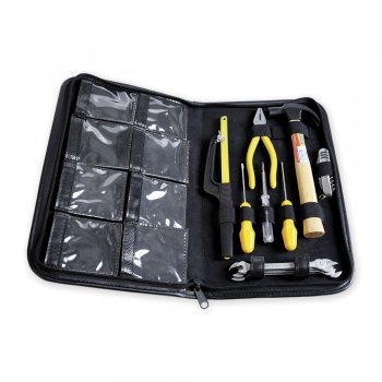 • Estojo com alicate universal 6", chave de fenda, chave philips, quatro chaves fixas 6/7 8/9 10/11 12/13, chave teste, martelo, canivete e mini arco de serra